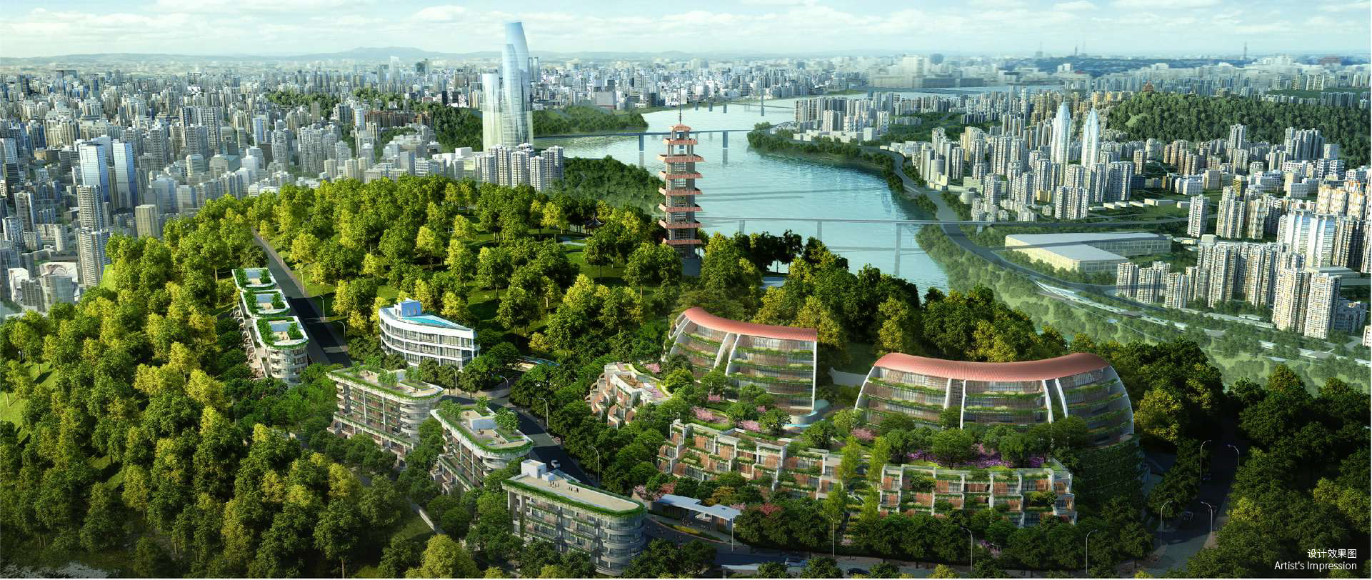 鹅岭峯,位于重庆市渝中区鹅岭公园旁,于鹅岭379米海拔高度之上,以新颖优美的建筑圆弧,勾勒出对话世界的建筑封面,将两江风景、鹅岭风光收揽于怀。